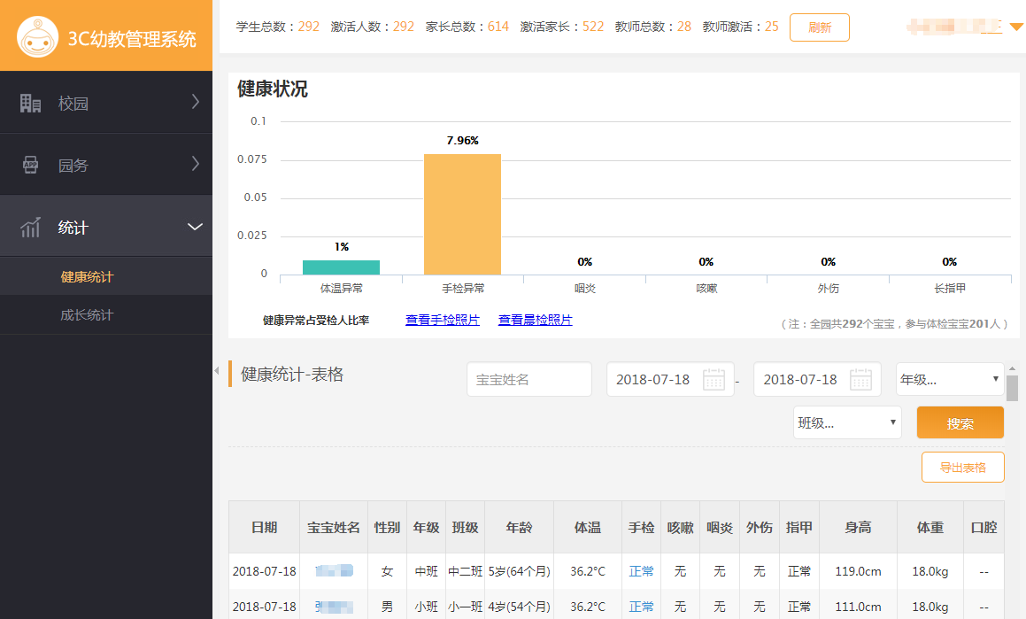 1、健康檢查:全市/全區在冊幼兒體溫狀況/體溫超標幼兒數/超標比率,出現預警,可以追溯至區/縣/園/班,查看歷史同期水平、比率;