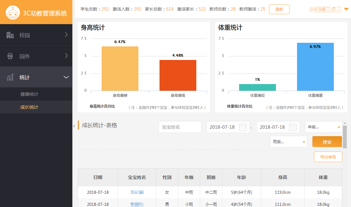 3、身高/體重:全市/全區在冊幼兒身高、體重狀況,各區/縣/園比較,歷史同期比較,可做政策制定參造;