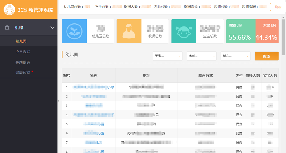 以市為單位,政府相關職能機構可以接入平臺系統,對轄區內的幼兒和教育機構進行管理;平臺提供寶寶日、月、年的健康成長監測報表,并提供預警提醒功能;集團幼兒園總部可通過平臺系統查看旗下所有幼兒園孩子的健康檢測記錄,為孩子在園健康成長護航。